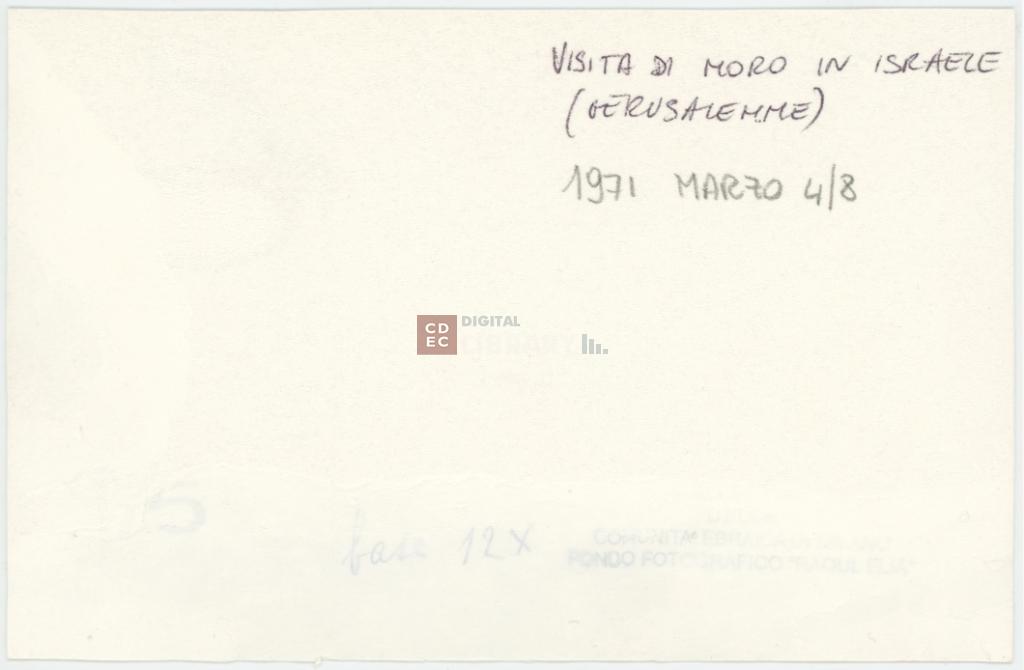 iscrizioni | sul verso del supporto iscrizione manoscritta in alto a destra "Visita di Moro in Israele/ (Gerusalemme)/ 1971 Marzo 4/8 " |