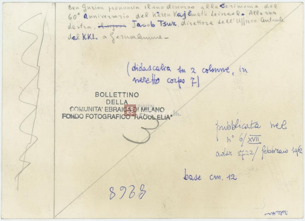 iscrizioni | sul verso del supporto le iscrizioni manoscritte "Ben Gurion pronuncia il suo discorso alla cerimonia del 60° anniversario del Kèren Kajémeth Leisrael. Alla sua destra, Jacob Tsur, direttore dell'ufficio centrale del K.K.L a Gerusalemme" e "pubblicata nel n°6/XVII adar 5722/ febbraio 1962" e indicazioni tipografiche |