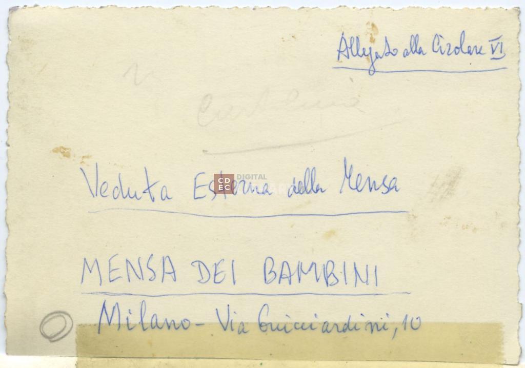 iscrizioni | sul verso del supporto l'indicazione manoscritta "Allegata alla circolare VI/ Veduta Esterna della Mensa/ Mensa dei Bambini via Guicciardini 10" |
