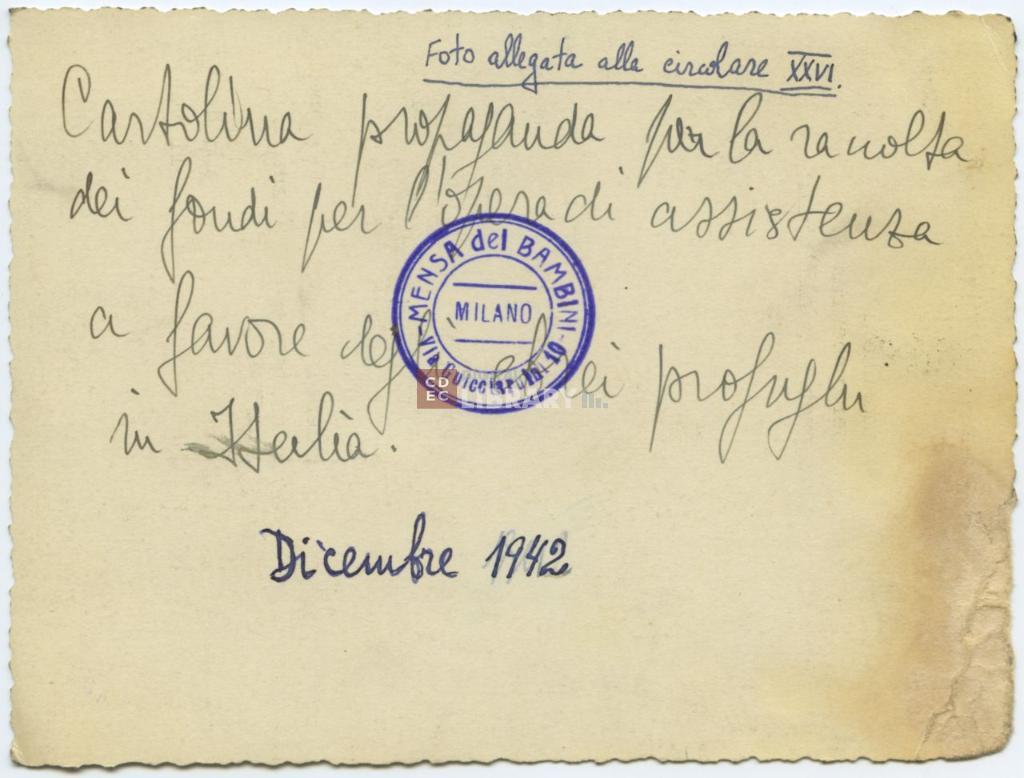 iscrizioni | sul verso del supporto l'indicazione manoscritta "Foto allegata alla circolare XXVI/ Cartolina propaganda per la raccolta dei fondi per l'opera di assistenza a favore degli ebrei profughi in Italia/ Dicembre 1942" |