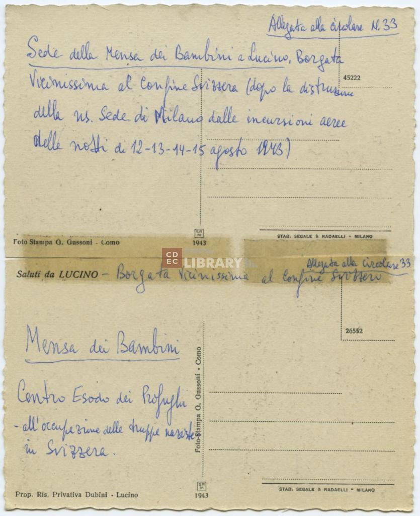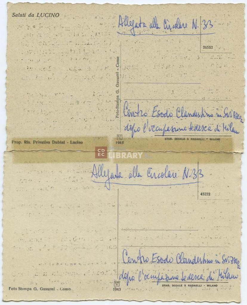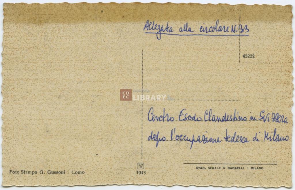 iscrizioni | sul verso del supporto l'indicazione manoscritta "Allegata alla circolare N. 33/ Centro Esodo Clandestino in Svizzera dopo l'occupazione tedesca di Milano" e scritte tipografiche con le indicazioni sull'autore e sul produttore della stampa |