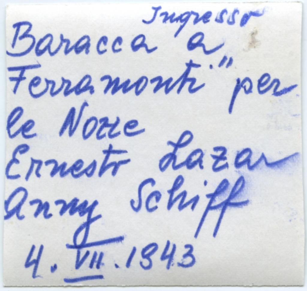 | iscrizioni | sul verso del supporto l'indicazione manoscritta "Ingresso Baracca a Ferramonti per le Nozze di Ernesto Lazar Anny Schiff 4.VII.1943" |