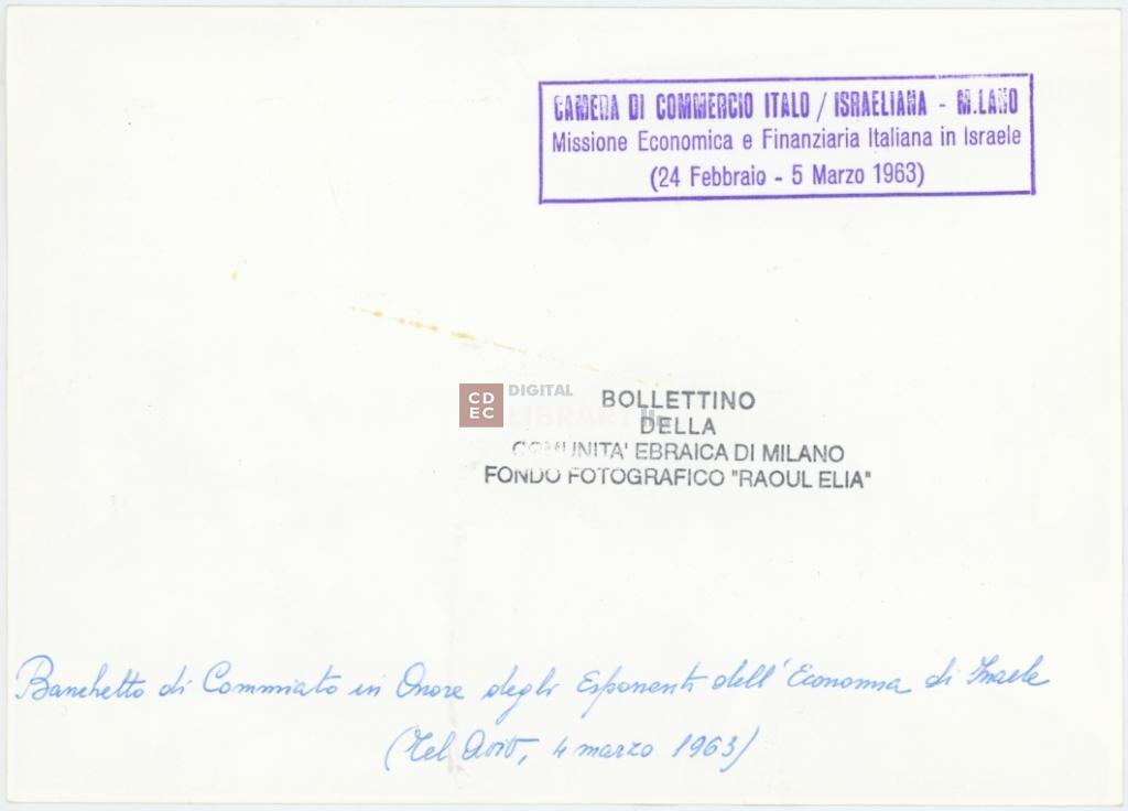 timbri, marchi | sul verso del supporto il timbro a inchiostro "Bollettino della Comunità ebraica di Milano/Fondo Fotografico "Raoul Elia" e il timbro a inchiostro blu "Camera di Commercio Italo/Israeliana - Milano/ Missione Economica e Finanziaria Italiana in Israele (24 Febbraio - 5 Marzo 1963)" |
