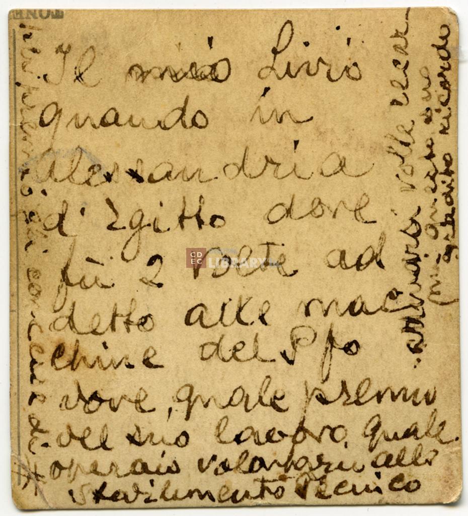 iscrizioni | sul verso del supporto una lunga dedica manoscritta: "Il mio Livio quando in Alessandria d'Egitto dove fù 2 volte addetto alle macchine del [P.fo] dove, quale premio del suo lavoro quale operaio volontario allo stabilimento tecnico, per premio gli concede di [...] volle recarmi questo suo gradito ricordo" |