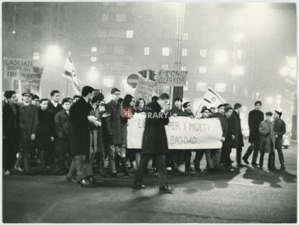 titolo attribuito | Veduta del corteo di protesta dei giovani ebrei lungo le vie di Milano per l'impiccagione di nove ebrei iracheni |