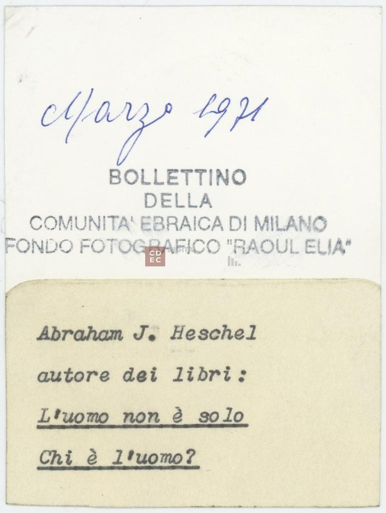 iscrizioni | sul verso del supporto primario iscrizioni manoscritta a penna in alto "Marzo 1971" - sul verso del supporto secondario la didascalia dattiloscritta "Abraham J. Heschel autore dei libri: L'uomo non è solo/ Chi è l'uomo?" |