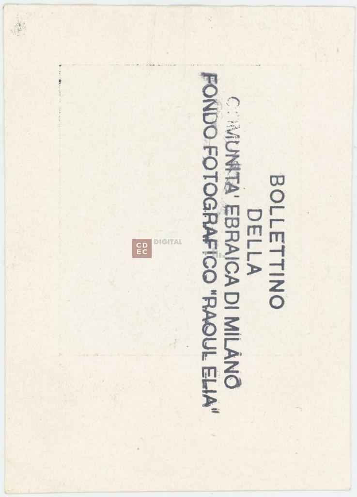 timbri, marchi | sul verso del supporto timbro ad inchiostro "GIU 1958" - sul verso della stampa fotomeccanica timbro a inchiostro "Bollettino della Comunità ebraica di Milano/ Fondo fotografico "Raoul Elia" |