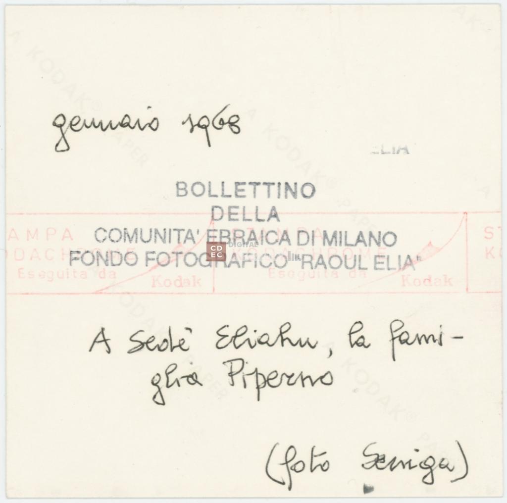 iscrizioni | sul verso del supporto iscrizione manoscritta a penna "gennaio 1968/ A Sedè Eliahu, la famiglia Piperno/ (foto Seniga)" |