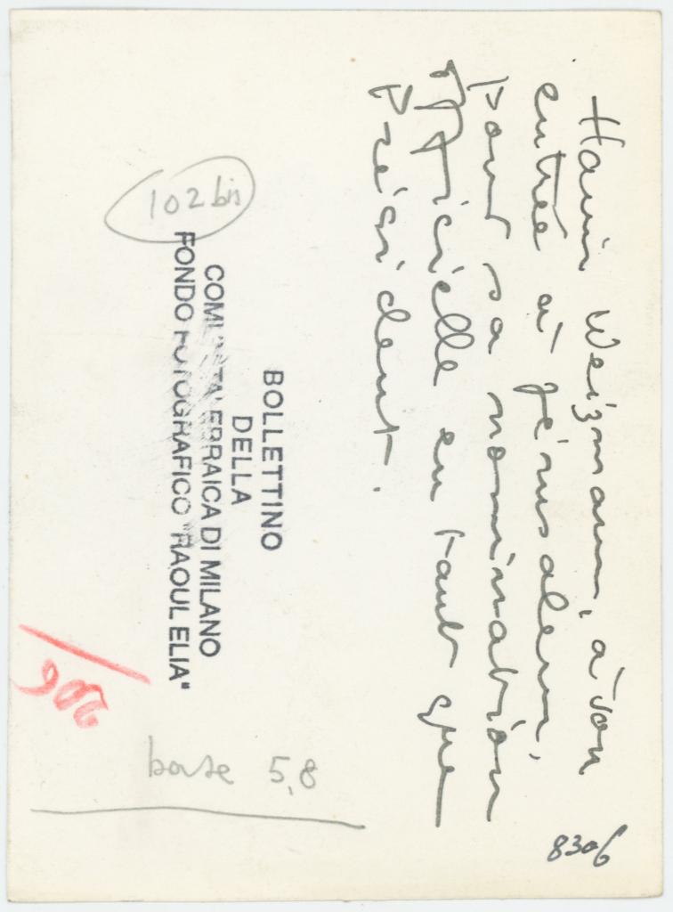 | timbri, marchi | sul verso del supporto il timbro a inchiostro "Bollettino della Comunità ebraica di Milano/ Fondo Fotografico "Raoul Elia" |