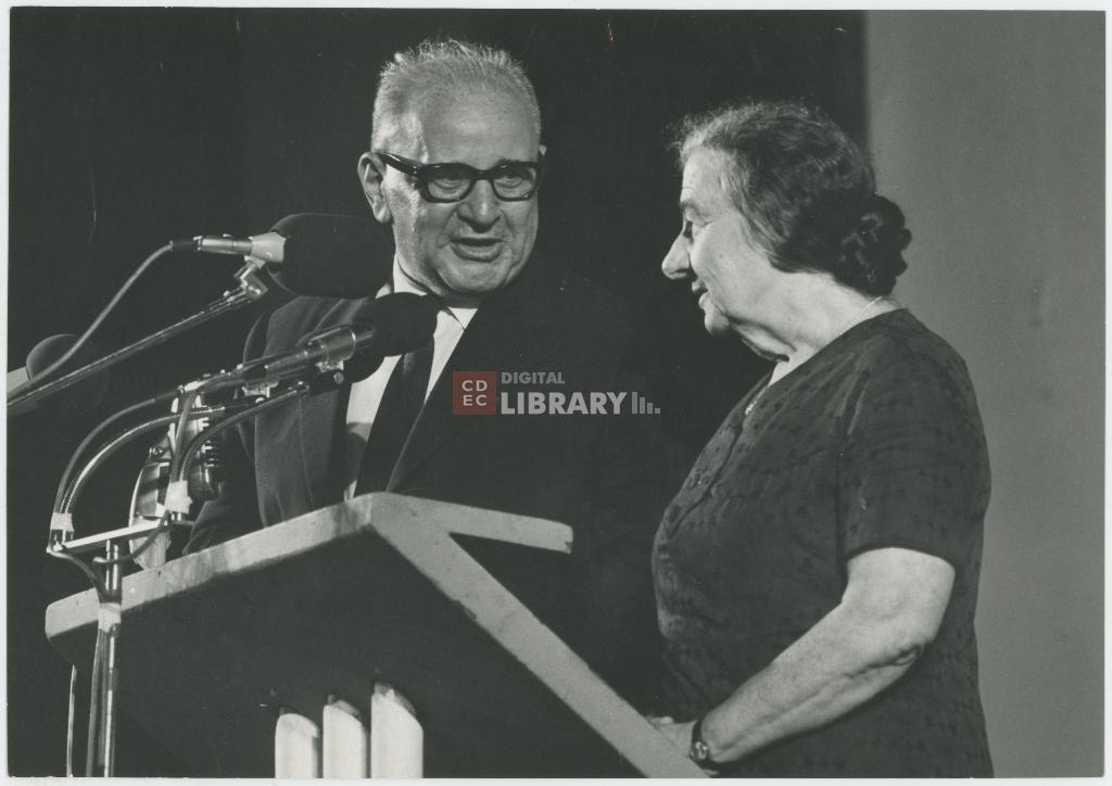 titolo attribuito | Ritratto del Primo Ministro Golda Meir con il Presidente del K.K.L Jacob Tsur alla Convention "Kol Ha-Adamà" per il 70° anniversario del K.K.L. |
