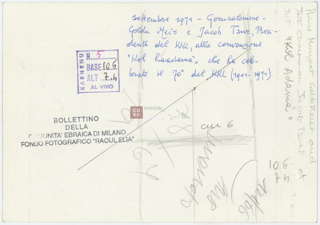 iscrizioni | sul verso del supporto l'iscrizione manoscritta a penna " settembre 1971 - Gerusalemme - Golda Meir e Jacob Tsur, Presidente del KKL, alla convenzione "Kol Haadamà" che ha celebrato il 70° del KKL (1901-1971)" e a matita " |