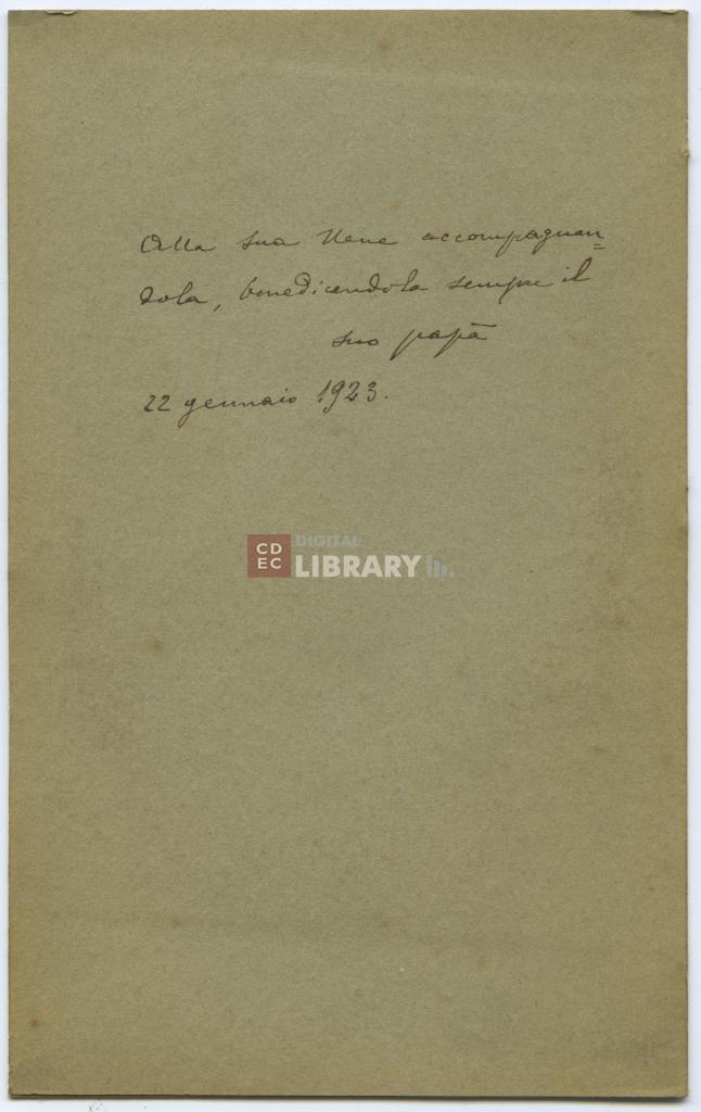 osservazioni | La dedica è di Augusto Osimo alla figlia Elena (detta Nene) ed è redatta pochi mesi prima della morte di Augusto, avvenuta il 22 luglio del 1923. |