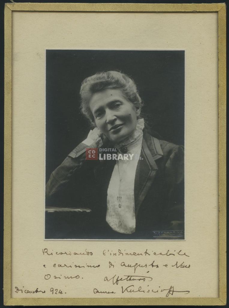 | osservazioni | La dedica che accompagna la fotografia è di Anna Kuliscioff ad Augusto e Nene Osimo e fu redatta esattamente un anno prima della scomparsa della Kuliscioff, avvenuta nel dicembre 1925. La fotografia fu scattata da Mario Nunes Vais a Firenze nel 1908, nel corso del 10° Congresso del Partito socialista italiano, e riprodotta da Emilio Sommariva a Milano tra il 1923 e il 1924. |