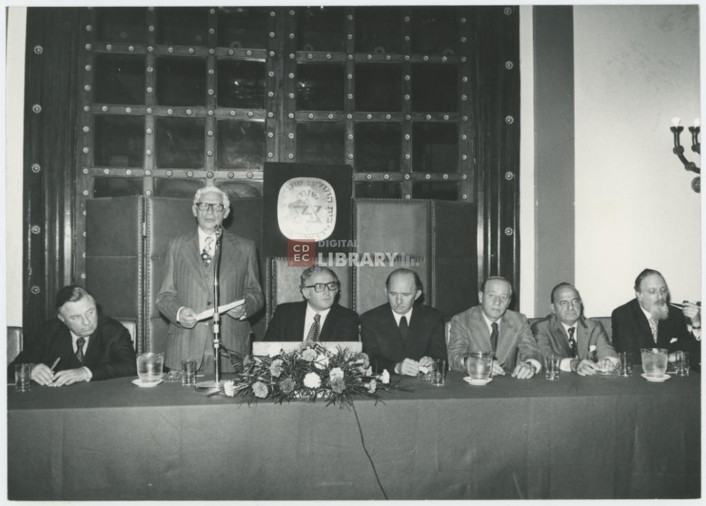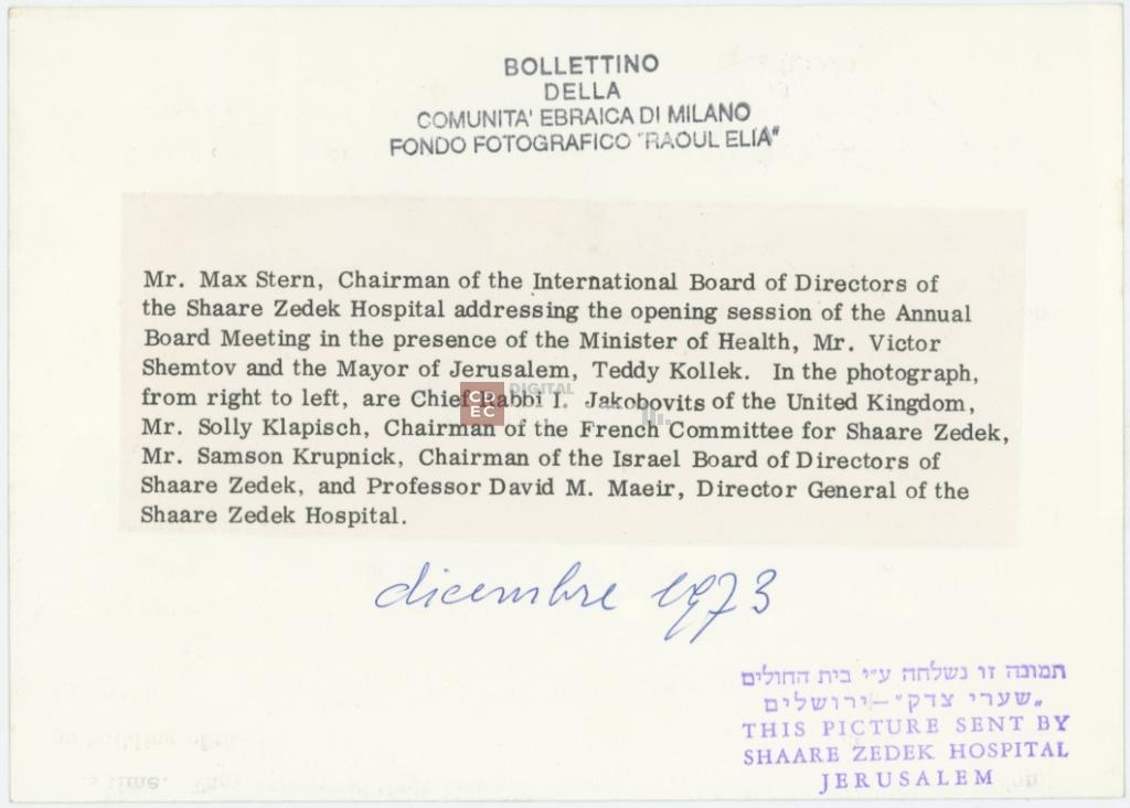 iscrizioni | sul verso del supporto la didascalia dattiloscritta "Mr. Max Stern, Chairman of the International Board of Directors of the Shaare Zedek Hospital addressing the opening session of the Annual Board Meeting in the presence of the Minister of Health, Mr. Victor Shemtov and the Mayor of Jerusalem, Teddy Kollek. In the photograph, from right to left, are Chief Rabbi I. Jakobovits of the United Kingdom, Mr. Solly Klapisch, Chairman of the French Committee for Shaare Zedek, Mr. Samson Krupnick, Chairman of the Israek Board of Directors of Shaare Zedek, and Professor David M. Maeir, Director General of the Shaare Zedek Hospital" e l'iscrizione manoscritta a penna "dicembre 1973" |