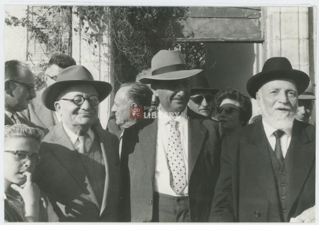 osservazioni | Nella fotografia si riconoscono da destra il Ministro delle Religioni (o dei Culti) Ya'akov Moshe Toledano, Umberto Nahon, il vice presidente della Società di Storia della Medicina e il vice sindaco di Tel Aviv Schechtermann [?] |
