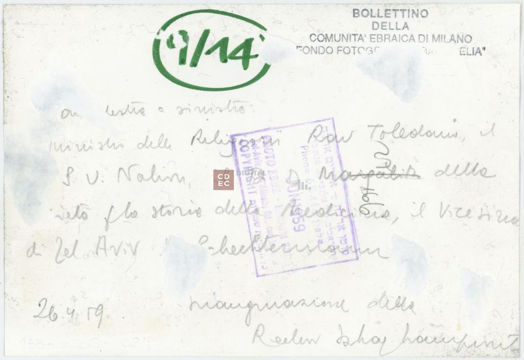 timbri, marchi | sul verso del supporto il timbro a inchiostro "Bollettino della Comunità ebraica di Milano/ Fondo fotografico "Raoul Elia " |