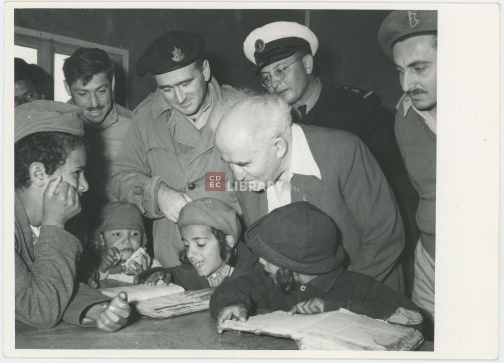 titolo attribuito | Ritratto di David Ben-Gurion insieme a giovani immigrati dello Yemen nel campo di transizione della Pardesia |
