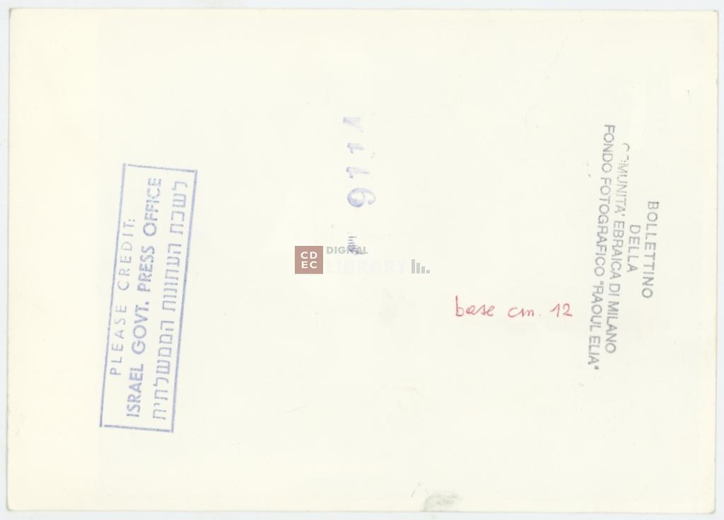 timbri, marchi | sul verso del supporto il timbro a inchiostro "Bollettino della Comunità ebraica di Milano/ Fondo fotografico "Raoul Elia", il timbro a inchiostro blu "Please credit/ Israel Govt. Press Office" e il timbro con il numero di serie "9114" |