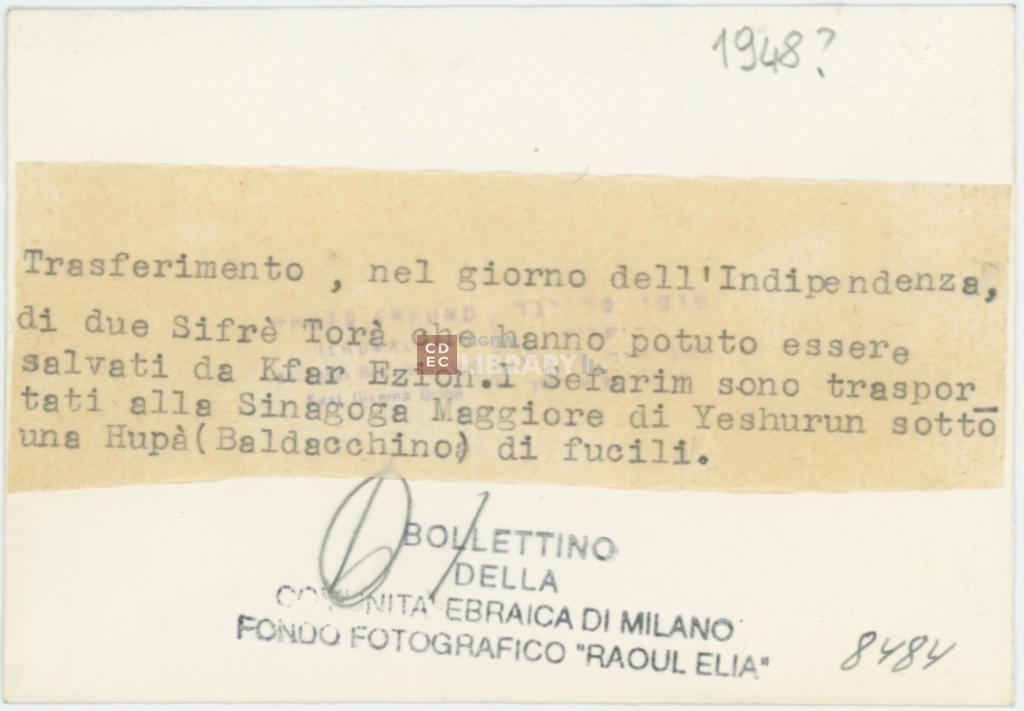 iscrizioni | sul verso del supporto primario la data "1948?" e il numero "8484" - sul verso del supporto secondario la didascalia dattiloscritta "Trasferimento, nel giorno dell'Indipendenza, di due Sifrè Torà che hanno potuto essere salvati da Kfar Ezion. I Sefarim sono trasportati alla Sinagoga Maggiore di Yeshurun sotto una Hupà (Baldacchino) di fucili" |