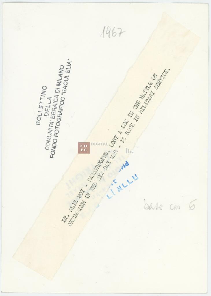 iscrizioni | sul verso del supporto secondario la didascalia dattiloscritta "Lt. Aliz Noy - Paratrooper. Lost a leg in the battle on Jerusalem in the six day war - is back in military service." |