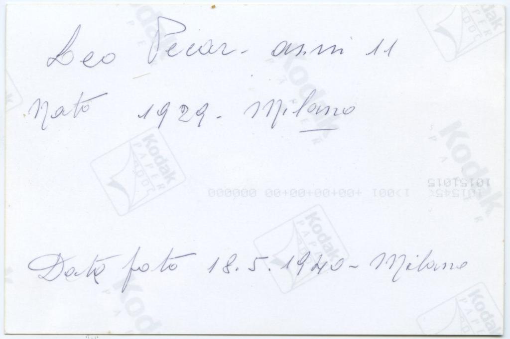 | iscrizioni | sul verso del supporto l'indicazione manoscritta "Leo Pecar anni 11 nato 1929 Milano/ Data foto 18.5.1940 - Milano" |