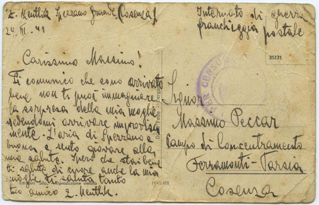 | notizie storico-critiche | Il 24 marzo 1941 Z. Neutlik (internato di guerra) invia all'amico Massimo Pecar (internato nel Campo di Concentramento di Ferramonti di Tarsia in provincia di Cosenza) questa cartolina |
