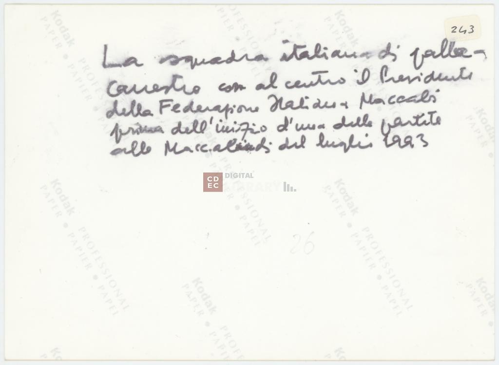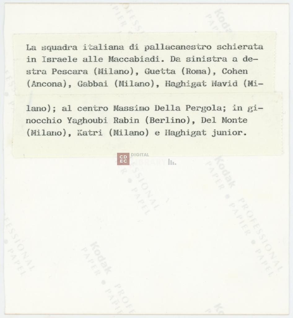 | iscrizioni | sul verso del primo supporto l'iscrizione manoscritta "La squadra italiana di pallacanestro con al centro il Presidente della Federazione israeliana Maccabi prima dell'inizio di una delle partite alle Maccabiadi del luglio 1993" e in alto a destra "243" - sul verso del secondo supporto la didascalia dattiloscritta "La squadra italiana di pallacanestro schierata in Israele alle Maccabiadi. Da sinistra a destra Pescara (Milano), Guetta (Roma), Cohen (Ancona), Gabbai (Milano), Haghigat Navid (Milano); al centro Massimo Della Pergola; in ginocchio Yaghoubi Rabin (Berlino), Del Monte (Milano), Katri (Milano) e Haghigat junior" |