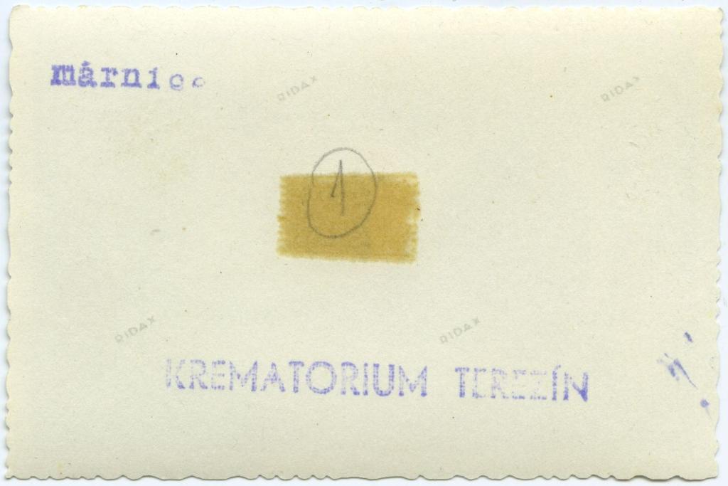 | timbri, marchi | sul verso del supporto il timbro a inchiostro blu con la scritta in lingua ceca "Krematorium Terezin/ marnico" [Crematorio Terezin/ camera mortuaria] |