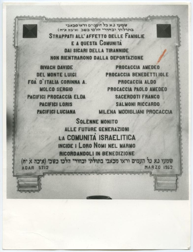 | osservazioni | La lapide riporta questa iscrizione "Strappati all'affetto delle famiglie e a questa Comunità dai sicari della tirannide non rientrarono dalla deportazione [segue elenco di 14 nomi]/ Solenne monito alle future generazioni la Comunità israelitica incide i Loro Nomi nel marmo ricordandoli in benedizione/ Adar 5712 Marzo 1952" |