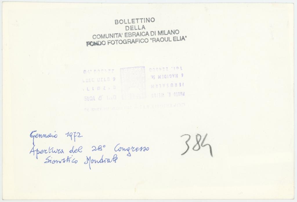 | timbri, marchi | sul verso del supporto il timbro a inchiostro con la scritta "Bollettino della Comunità Ebraica di Milano/ Fondo fotografico "Raoul Elia" e il timbro con il marchio commerciale del fotografo |
