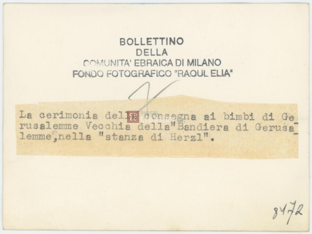 | iscrizioni | sul verso del supporto la didascalia dattiloscritta "La cerimonia della consegna ai bimbi di Gerusalemme Vecchia della "Bandiera di Gerusalemme, nella "stanza di Herzl" e in basso a destra il numero di inventario "8472" |