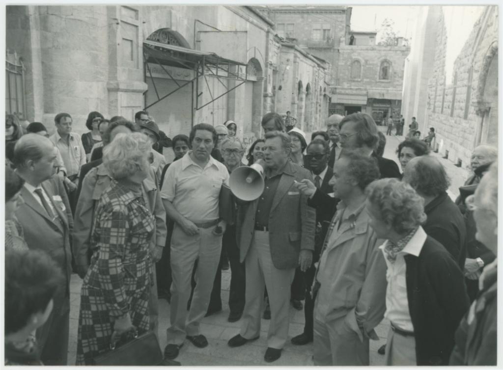 | osservazioni | Nella fotografia si riconosce, al centro con un megafono in mano, il Sindaco di Gerusalemme Theodor (Teddy) Kollek mentre illustra al Comitato cittadino i lavori eseguiti nella Città Vecchia di Gerusalemme (restauro delle facciate dei negozi, sistemazione delle fognature e riparazione delle strade) |