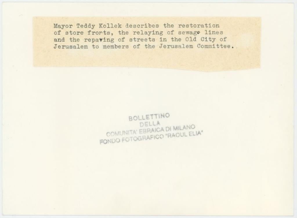 | iscrizioni | sul verso del supporto la didascalia dattiloscritta "Mayor Teddy Kollek describes the restoration of store fronts, the relaying of sewage lines and the repairing of streets in the Old City of Jerusalem to members of the Jerusalem Committee." |