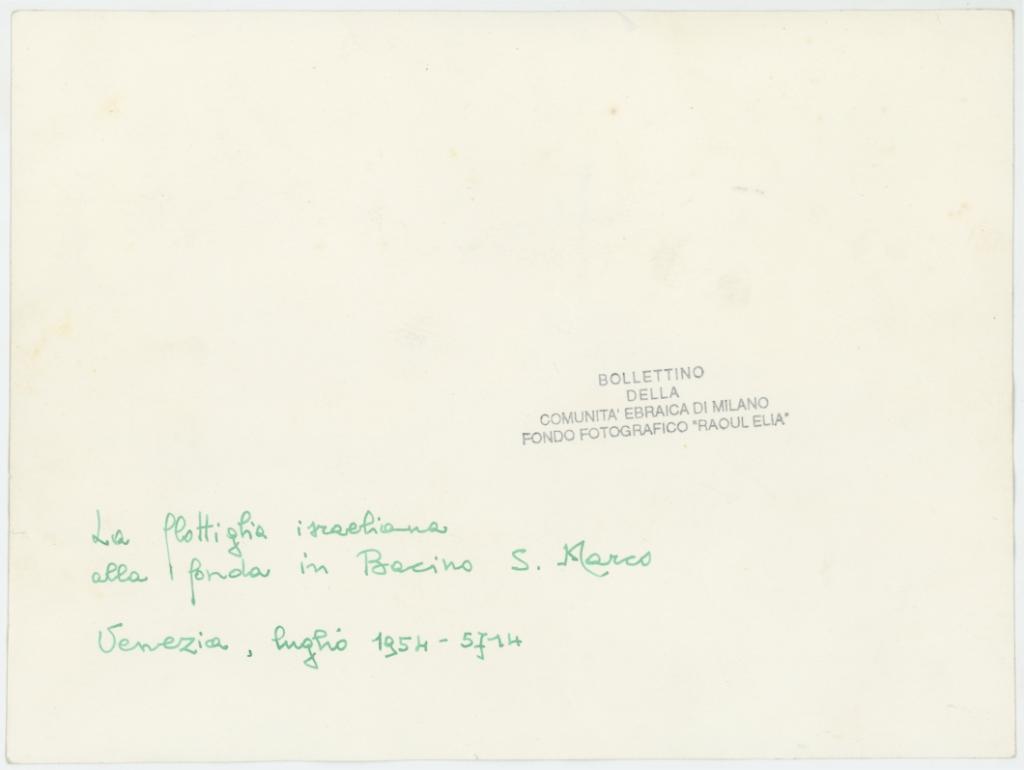 | iscrizioni | sul verso del supporto iscrizione a penna "La flottiglia israeliana alla fonda in Bacino S. Marco/ Venezia, luglio 1954 - 5714" |