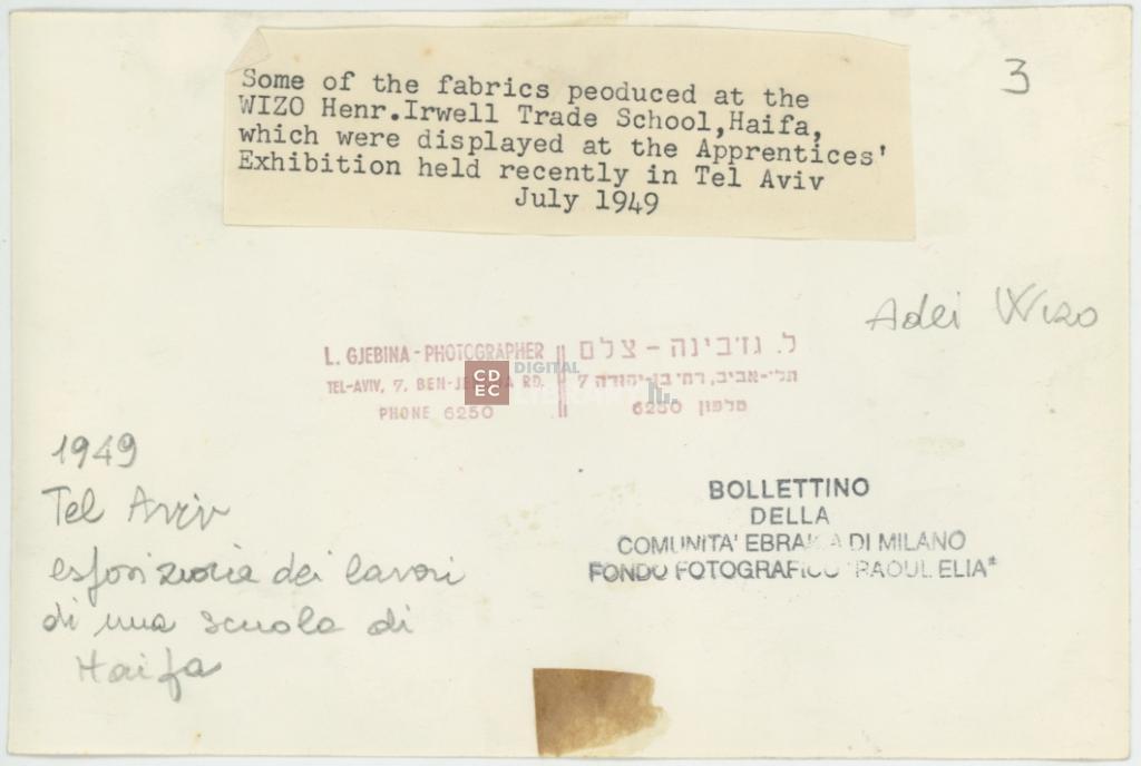 iscrizioni | sul verso del supporto l'etichetta con la didascalia dattiloscritta "Some of the fabrics peoduced [sic] at the WIZO Henr. Irwell Trade School, Haifa, which were displayed at the Apprentices' Exhibition held recently in Tel Aviv/ July 1949"; in basso a sinistra l'iscrizione manoscritta a matita "1949/ Tel Aviv/ esposizione dei lavori di una scuola di Haifa" e al centro a destra "Adei Wizo" |
