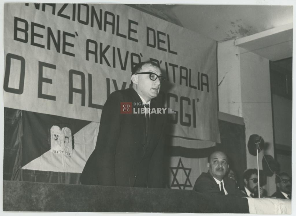 iscrizioni | sul verso del supporto in basso a destra l'iscrizione manoscritta a penna rossa "15-17 marzo 1968/ Raduno del Benè Akivà d'Italia" - sul supporto la didascalia dattiloscritta "Parla l'avv. Mario Minerbi (in secondo piano il Sig. Liuzzi, Servi, Zuriel Shalom" - nell'immagine un cartello con la scritta "Raduno Nazionale del Movimento Benè Akivà d'Italia/ Sionismo e Aliyà oggi" |