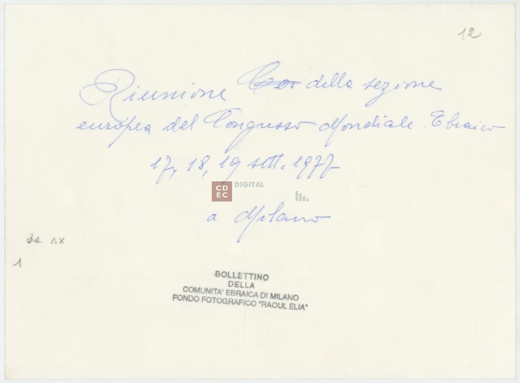 iscrizioni | sul verso del supporto l'iscrizione manoscritta a penna "Riunione della sezione europea del Congresso Mondiale Ebraico/ 17,18,19 sett. 1977 a Milano" |