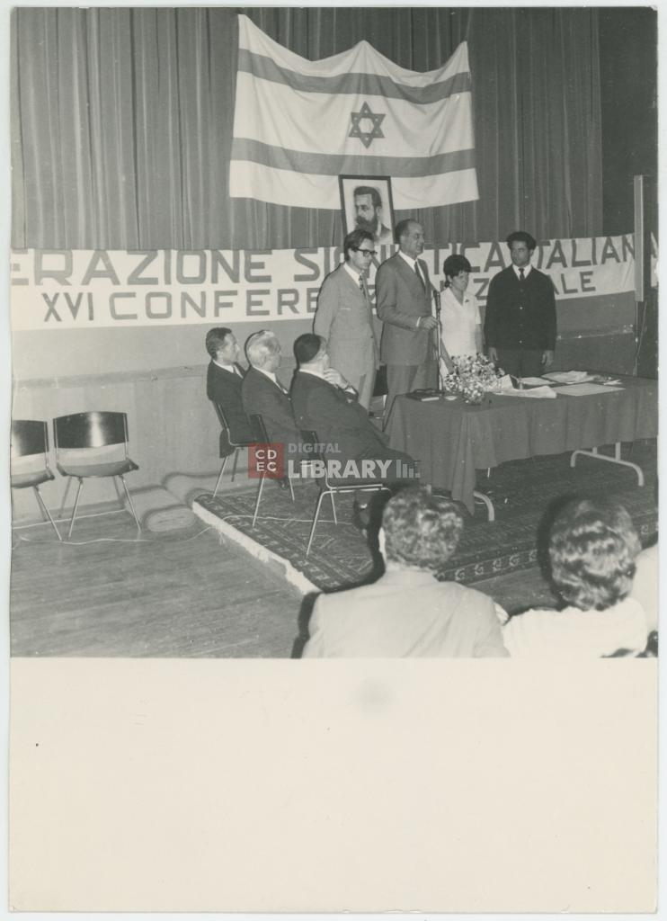 osservazioni | Il quadro presente nello scatto mostra un ritratto di Theodor Herzl; al di sotto sullo striscione la scritta "Federazione Sionistica Italiana/ XVI Conferenza Nazionale". Si presume che la Conferenza si sia tenuta a Milano, sede della Federazione |