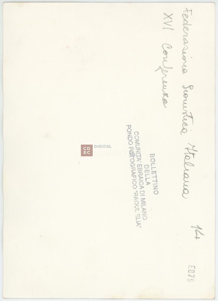 timbri, marchi | sul verso del supporto il timbro a inchiostro "Bollettino della Comunità ebraica di Milano/ Fondo Fotografico "Raoul Elia" e in alto a destra un timbro con il numero di serie "E879" |