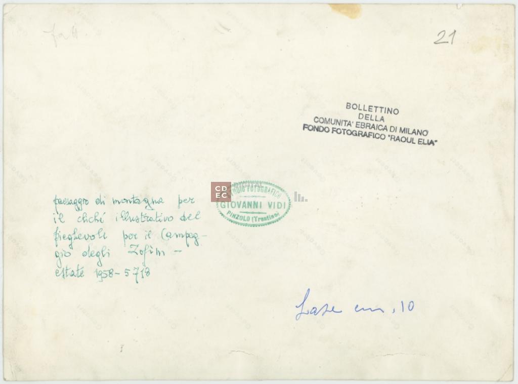 iscrizioni | sul verso del supporto l'iscrizione manoscritta a penna "paesaggio di montagna per il cliché illustrativo del pieghevole per il Campeggio degli Zofim - estate 1958-5718" e indicazioni tipografiche |