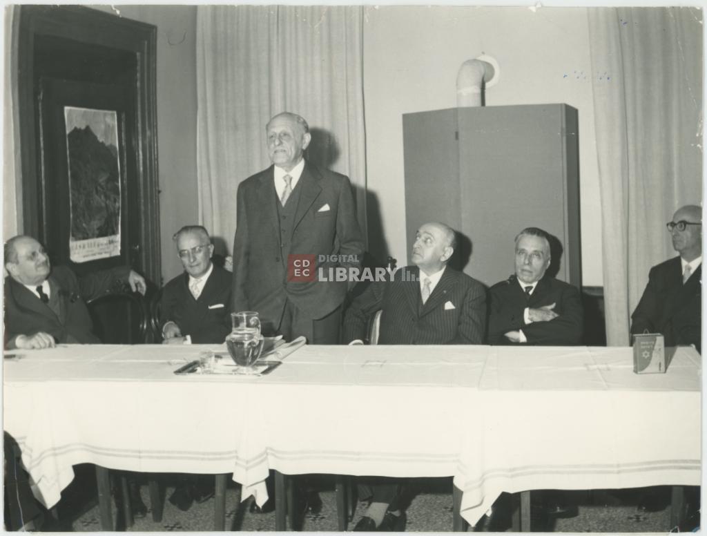notizie storico-critiche | Nel corso della riunione annuale del Keren Kayemeth LeIsrael (KKL), tenutasi nella sede della Comunità israelitica di Venezia, si svolse la cerimonia di consegna del certificato d'iscrizione nel Libro d'oro del KKL Italia (Fondo Nazionale Ebraico) all'avvocato professor Angelo Sullam. All'evento parteciparono il Presidente della Federazione Sionistica Italiana avvocato Carlo Alberto Viterbo, il Presidente della Commissione veneziana del KKL Carlo Godelli, l'avvocato Angelo Sullam (in piedi), il Presidente centrale per l'Italia del KKL dottore Nino Donati, il Rabbino Capo di Venezia Leone Leoni, il Vicepresidente nazionale del KKL Italia Fausto Sabatello. |