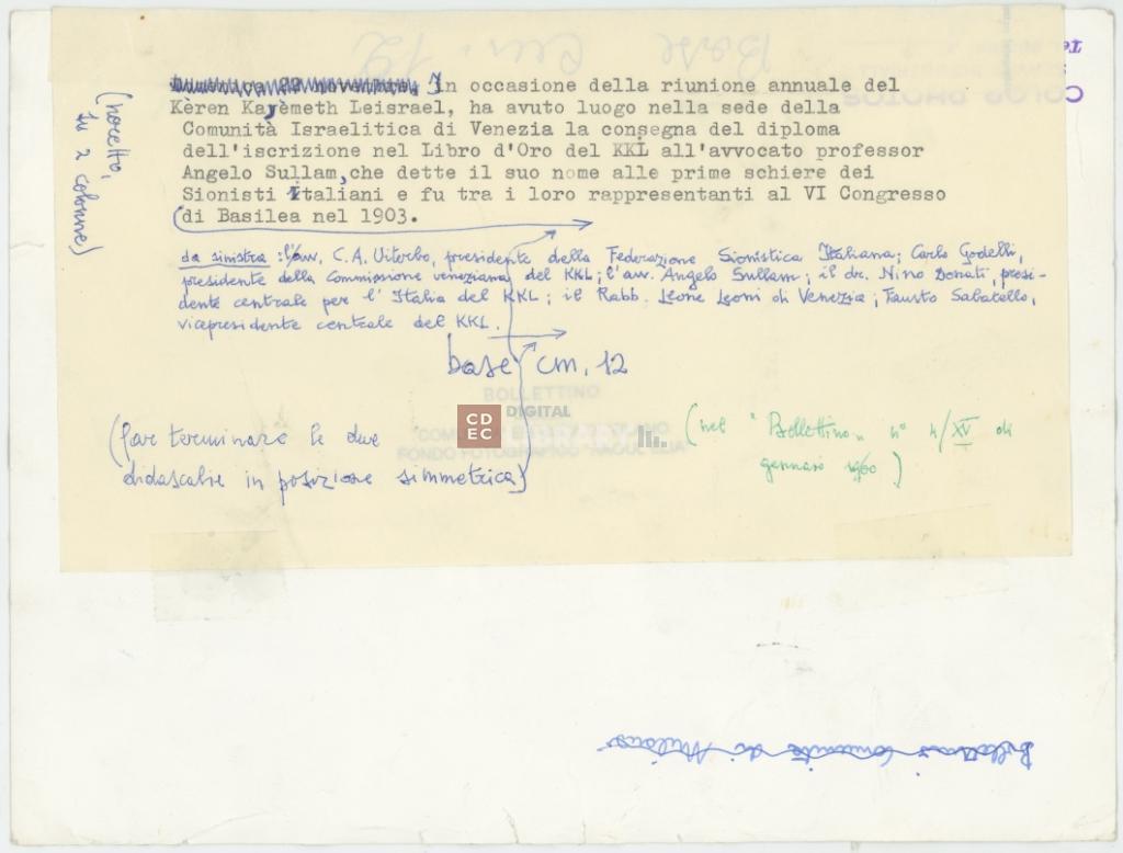 iscrizioni | sul verso del supporto secondario in alto la didascalia dattiloscritta "In occasione della riunione annuale del Kèren Kajèmeth Leisrael, ha avuto luogo nella sede della Comunità Israelitica di Venezia la consegna del diploma dell'iscrizione nel Libro d'Oro del KKL all'avvocato professor Angelo Sullam, che dette il suo nome alle prime schiere dei Sionisti Italiani e fu tra i loro rappresentanti al VI Congresso di Basilea nel 1903" e manoscritta a penna "da sinistra: l'avv. C.A. Viterbo, presidente della Federazione Sionistica Italiana; Carlo Godelli, presidente della Commissione veneziana del KKL; l'avv. Angelo Sullam; il dr. Nino Donati, presidente centrale per l'Italia del KKL; il Rabb. Leone Leoni di Venezia; Fausto Sabatello, vicepresidente centrale del KKL", a destra al centro l'iscrizione manoscritta a penna verde "(nel "Bollettino" n° 4/XV di gennaio 1960)" e indicazioni tipografiche |