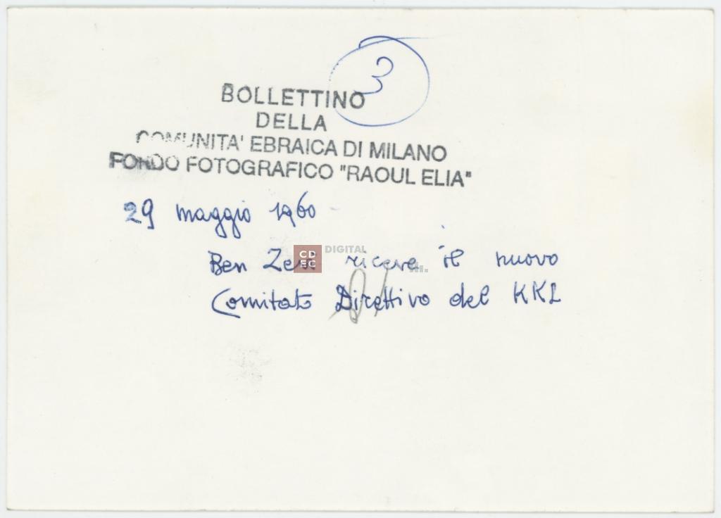 iscrizioni | sul verso del supporto iscrizione manoscritta a penna "29 maggio 1960 Ben Zevi riceve il nuovo Comitato Direttivo del KKL" |