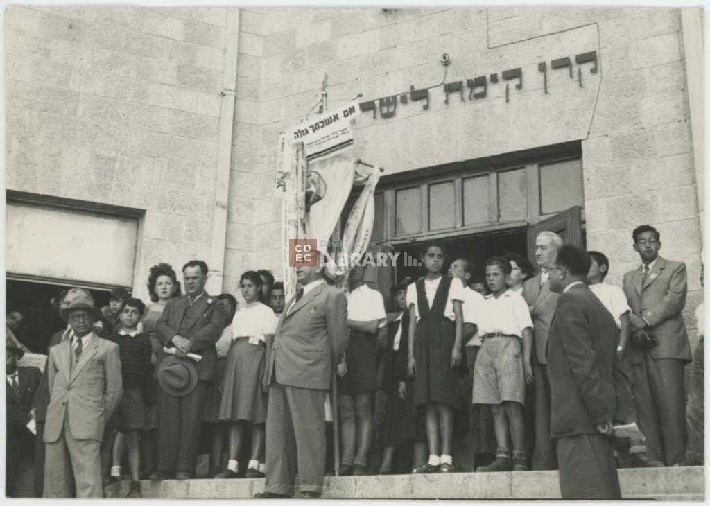 titolo attribuito | Ritratto di un gruppo rappresentativo dei bambini della Città Santa di Gerusalemme davanti alla sede centrale del Fondo Nazionale Ebraico mentre ricevono la "Bandiera di Gerusalemme" |