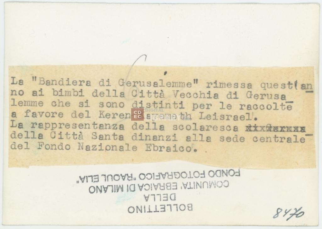 iscrizioni | nell'immagine sul muro di pietra la scritta קרן קימת לישראל [trad. Keren Kayemet LeYisrael] - sul verso del supporto secondario la didascalia dattiloscritta "La "Bandiera di Gerusalemme" rimessa quest'anno ai bimbi della Città Vecchia di Gerusalemme che si sono distinti per le raccolte a favore del Keren Kayemeth Leisrael. La rappresentanza della scolaresca della Città Santa dinanzi alla sede centrale del Fondo Nazionale Ebraico" |