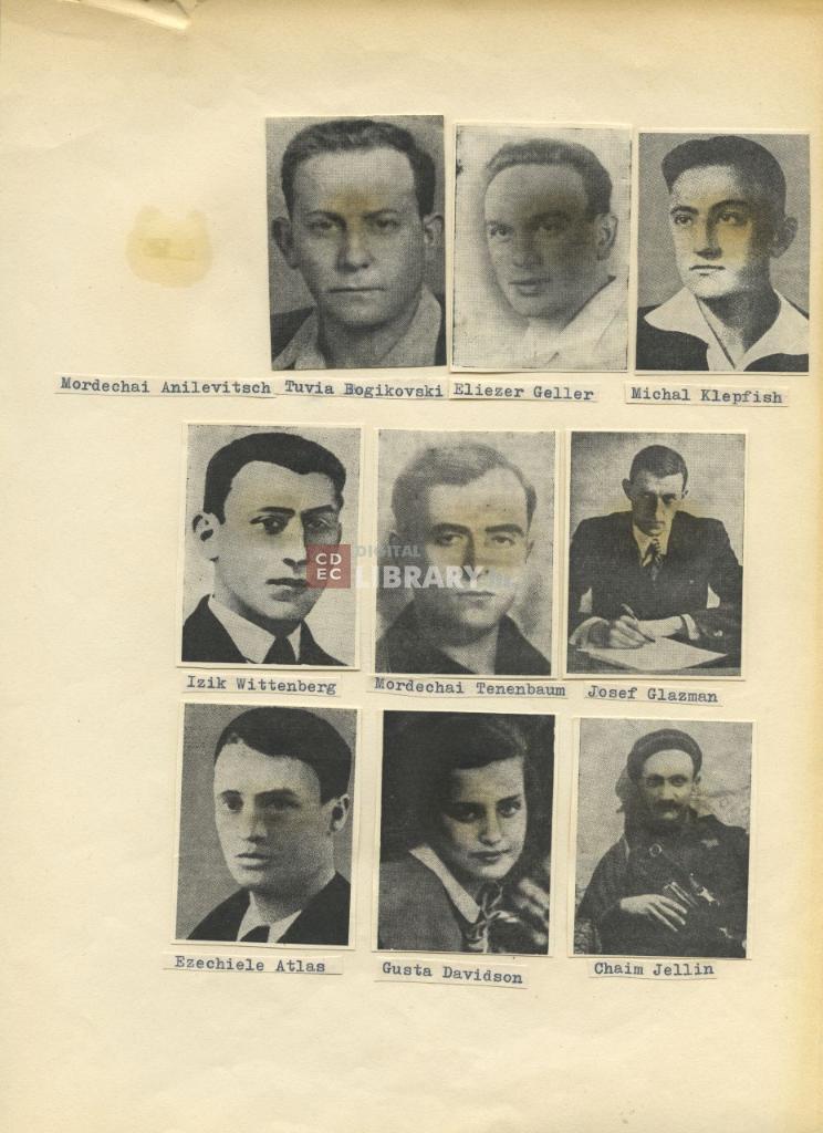 | osservazioni | Ogni fotografia รจ accompagnata da una didascalia che riporta il nome della persona ritratta. In ordine dall'alto in basso e da destra a sinistra: "Mordechai, Anilevitsch / Tuvia Bogikovski / Eliezer Geller / Michal Klepfish / Izik Wittenberg / Mordechai Tenenbaum / Josef Glazman / Ezechiele Atlas / Gusta Davidson / Chaim Jellin" Si segnala che il ritratto di Mordechai Anielewicz, scollatosi dal supporto, risulta al momento disperso. Molti furono martiri, deportati o uccisi durante le rivolte nei ghetti polacchi. Israel Kalk, in una nota manoscritta allegata, li indica come "Eroi della Resistenza - Capi della Resistenza/ I capi di alcune insurrezioni nei Ghetti e rivolte nei Campi". Eliezer Geller viene arrestato nel 1943 e deportato dalla Polonia. |
