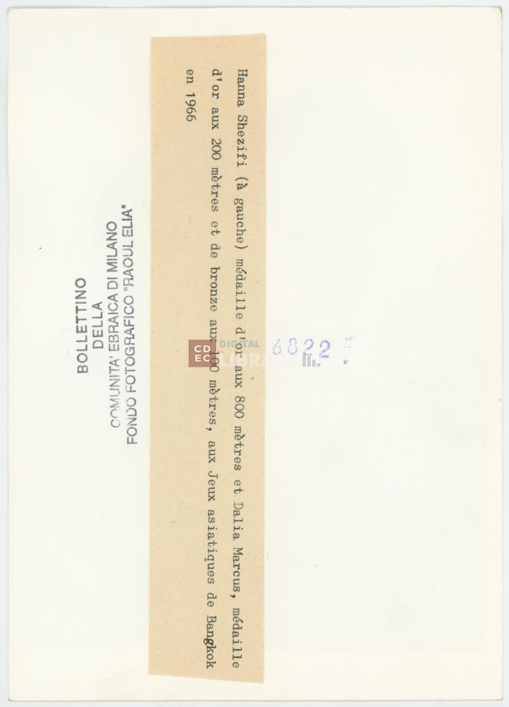 iscrizioni | sul verso del supporto secondario la didascalia dattiloscritta "Hanna Shezifi (à gauche) mèdaille d'or aux mètres et Dalia [sic] Marcus, mèdaille/ d'or aux 200 mètres et de bronze aux 100 mètres, aux Jeux asiatiques de Bangkok/ en 1966" |