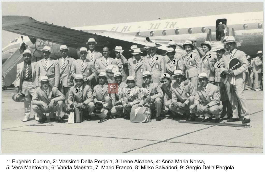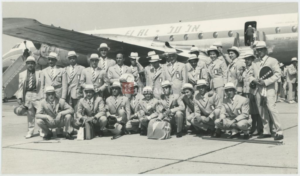 | notizie storico-critiche | Lo scatto ritrae gli atleti della Squadra italiana in partenza con un volo El Al dall'aeroporto di Roma-Fiumicino alla volta di Israele, per partecipare alla sesta Maccabiade che si tenne a Ramat Gan, nei pressi di Tel Aviv (Israele), dal 29 agosto al 6 settembre 1961. A capo della Delegazione vi era Massimo Della Pergola, Presidente della Federazione Italiana Maccabi. Nell'articolo apparso sul "Bollettino della Comunità Israelitica di Milano" si sottolinea che le divise indossate dalla rappresentativa italiana erano quelle avanzate dal CONI dalla Olimpiade del 1960. |