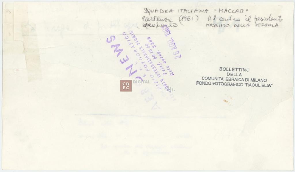 | iscrizioni | sul verso del supporto secondario in alto a destra l'iscrizione manoscritta a penna "Squadra italiana "Maccabi"/ Partenza aeroporto (1961)/ Al centro il presidente Massimo Della Pergola" |
