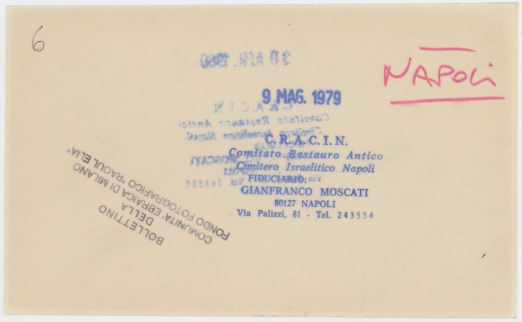 timbri, marchi | sul verso del supporto il timbro a inchiostro "Bollettino della Comunità ebraica di Milano/ Fondo Fotografico "Raoul Elia" e il timbro a inchiostro blu con la data "9 MAG. 1979" e la scritta "C.R.A.C.I.N. Comitato Restauro Antico Cimitero Israelitico Napoli/ Fiduciario: Gianfranco Moscati 80127 Napoli Via Palizzi, 81 - Tel. 243554" |